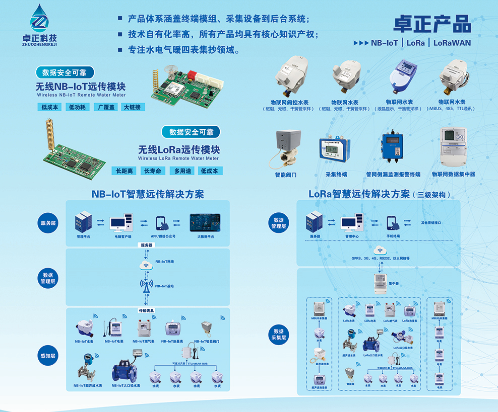 河南卓正電子科技有限公司,專業的物聯網表應用方案提供商,擁有一支多名博士、碩士組成的核心研發團隊,率先將NB-IoT、LoRa遠傳技術、智能閥控技術應用于水務、熱力、燃氣、農業、消防、環境領域,以“領航智能儀表 構建智慧城市”為企業使命,立志成為中國智能儀表行業領域中的領跑者,為推動中國能源計量事業的發展貢獻自己的力量!