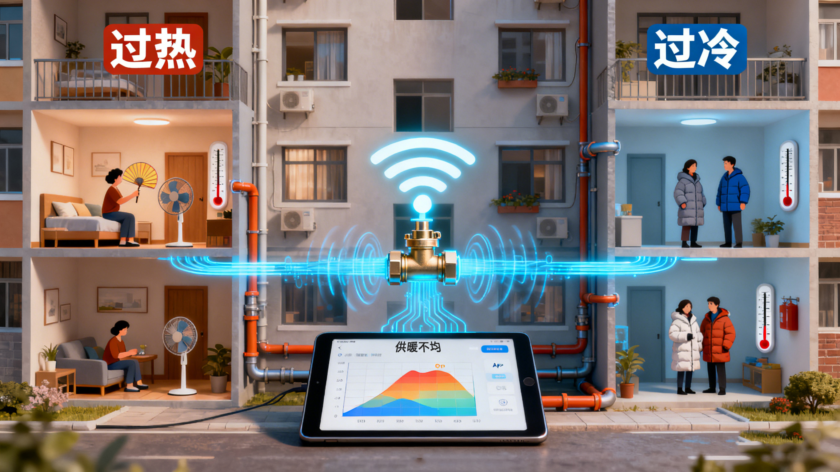 想象一下,我們的供暖管道如同人體的血液循環系統。熱水就是血液,需要被均勻地輸送到每個房間(末端,如暖氣片或地暖盤管)。水利失衡就是指,由于管道長度、阻力不同等原因,導致離熱源(鍋爐或換熱站)近的“近端”循環過快,水流過大,房間過熱;而離熱源遠的“遠端”循環不暢,水流過小,房間冰冷。這不僅造成了用戶體驗差,更導致了大量的能源浪費。